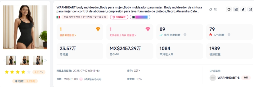 一款叫WARMHEART Bodymoldeador的塑身衣,最近28天内在TikTok墨西哥站卖了1.2万件,销售额达到了367万墨西哥比索,约合人民币130万元。在女士塑身衣品类里,稳稳占据热销榜前列。